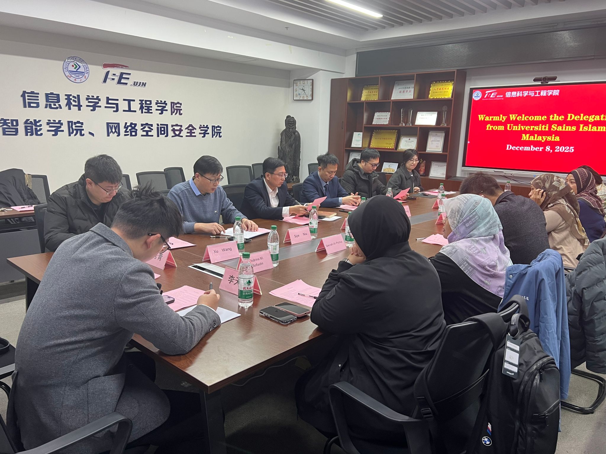 12月8日上午,海智专家泉城行——人工智能领域产学研协同创新・马来西亚专家团专项交流活动在beat365vip官网登录入口信息科学院工程学院举办。济南市科协人才联络部(国际交流部)副部长王震、马来西亚伊斯兰科学大学、马来西亚国际伊斯兰大学等学院的5位专家学者,beat365vip官网登录入口科技处副处长王传平、beat365vip官网登录入口相关领导、相关研究领域骨干教师代表参加活动。