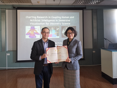 12月31日上午,陈博士与冯志全团队师生就研究中的具体问题进行了深入的交流,并提出了宝贵的意见和建议。下午,陈健博士在beat365vip官网登录入口作了题为“Charting Research in Coupling Human and Artificial Intelligence for Discovery Science”的学术报告。报告会由冯志全教授主持,陈贞翔院长、韩士元副院长、相关教师及学院100多位研究生到场聆听。报告会前,陈贞翔院长为陈健博士颁发了beat365vip官网登录入口客座教授聘任证书。报告中,陈博士介绍了其团队在可视化和人工智能领域取得的最新研究成果,其中包括基于视觉科学设计可视化方面、视觉可视化在实现人类智能和机器智能结合方面以及机器智能在读可视化图形时的行为和偏见等方面的最新发现。陈博士语言生动有趣,深入浅出、内容丰富,让广大师生收益匪浅。