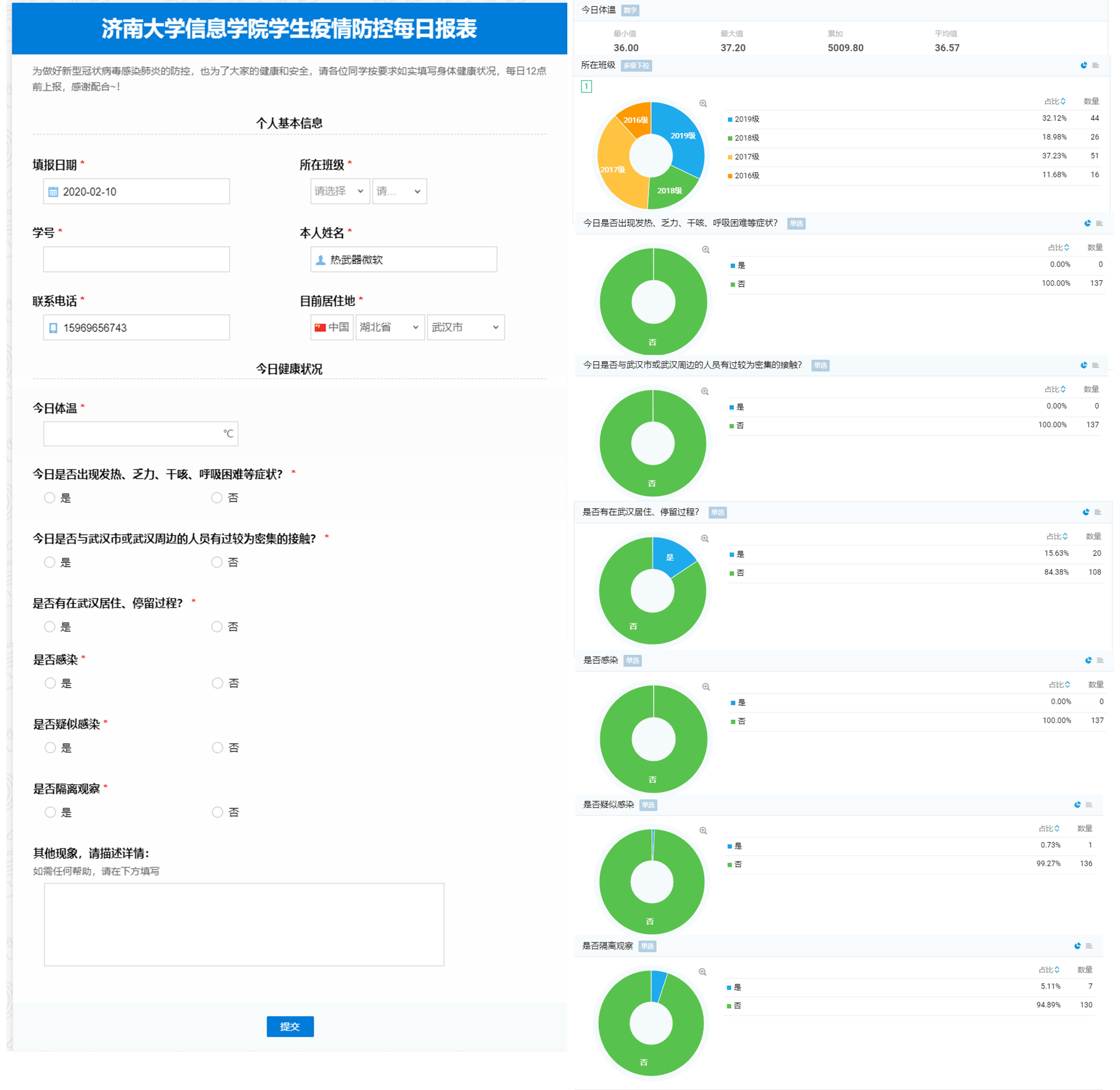 对于学院教职工,建立系部主任定期汇报制度,对本系部教师情况进行摸排汇总,并及时汇报;对全体学生,以年级、班级为单位,建立辅导员—主要学生干部—全班学生的疫情防控信息网,每日排查班级同学身体健康情况并汇总上报,实时掌握全院学生情况,并及时通过网络宣传、群发通知等方式号召同学们响应国家和学校号召,服从当地、学校、学院疫情防控工作安排,居家做好科学抗疫的带头者;对有湖北地区停留史、与相关人员有接触以及疫情较严重地区的学生及时进行完善摸排,推出“beat365vip官网登录入口信息学院学生疫情防控每日报表”系统,通过系统可快速、全面的掌握学生每日动态信息,更有针对性的做好疫情防控工作。