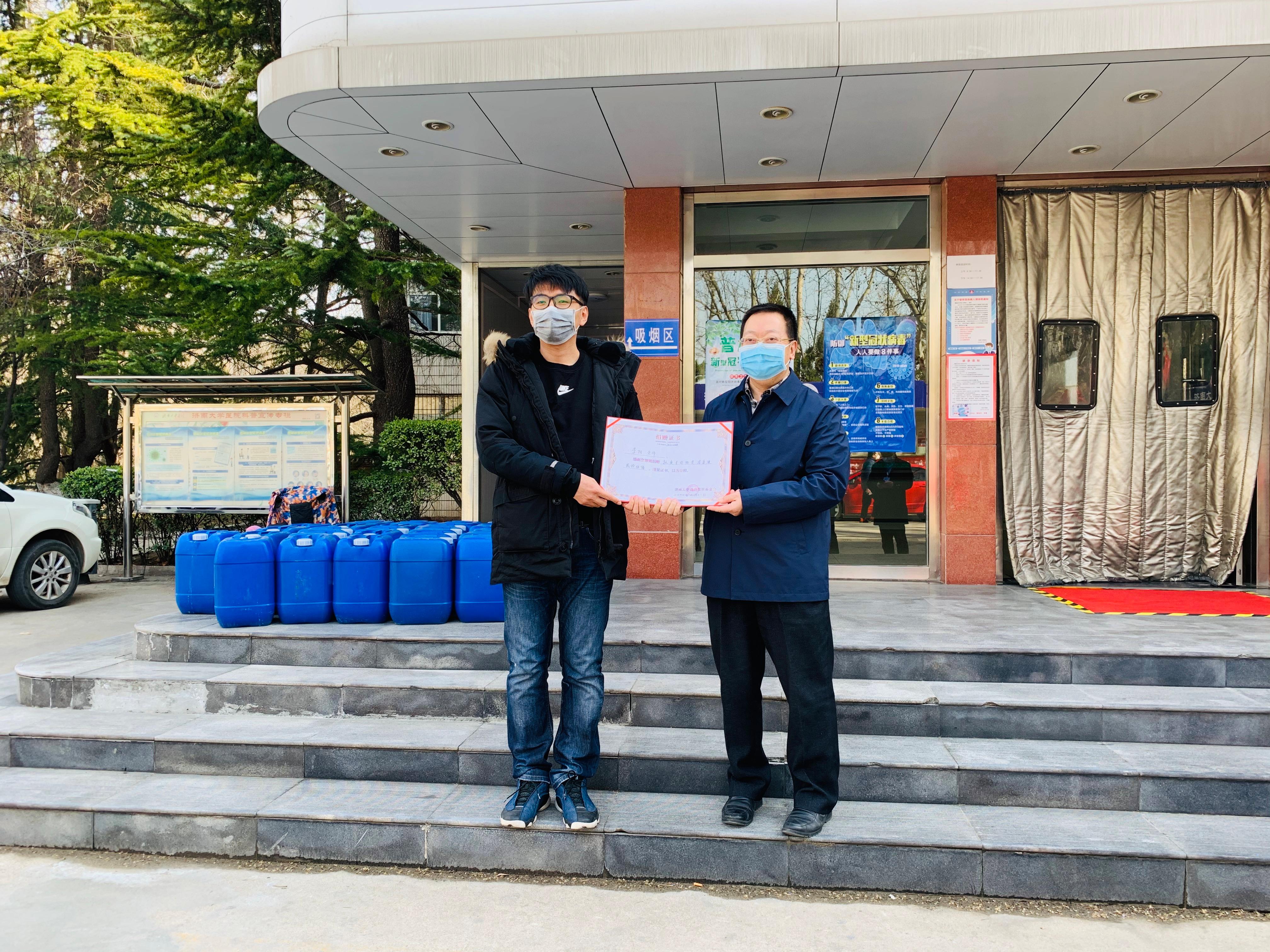 当前,新冠肺炎疫情防控进入关键时期,疫情的防控工作也牵动着每一位“济大人”的心。李阳老师在得知学校防疫物资紧缺的情况后,积极联系厂商,专门从生产地采购消毒液,并全部捐赠给学校。李阳老师说:“抗击疫情人人有责,虽然不能战斗在抗‘疫’一线,但希望能够尽自己的绵薄之力,为学校疫情防控工作奉献一份爱心,共同迎接新学期的到来。”