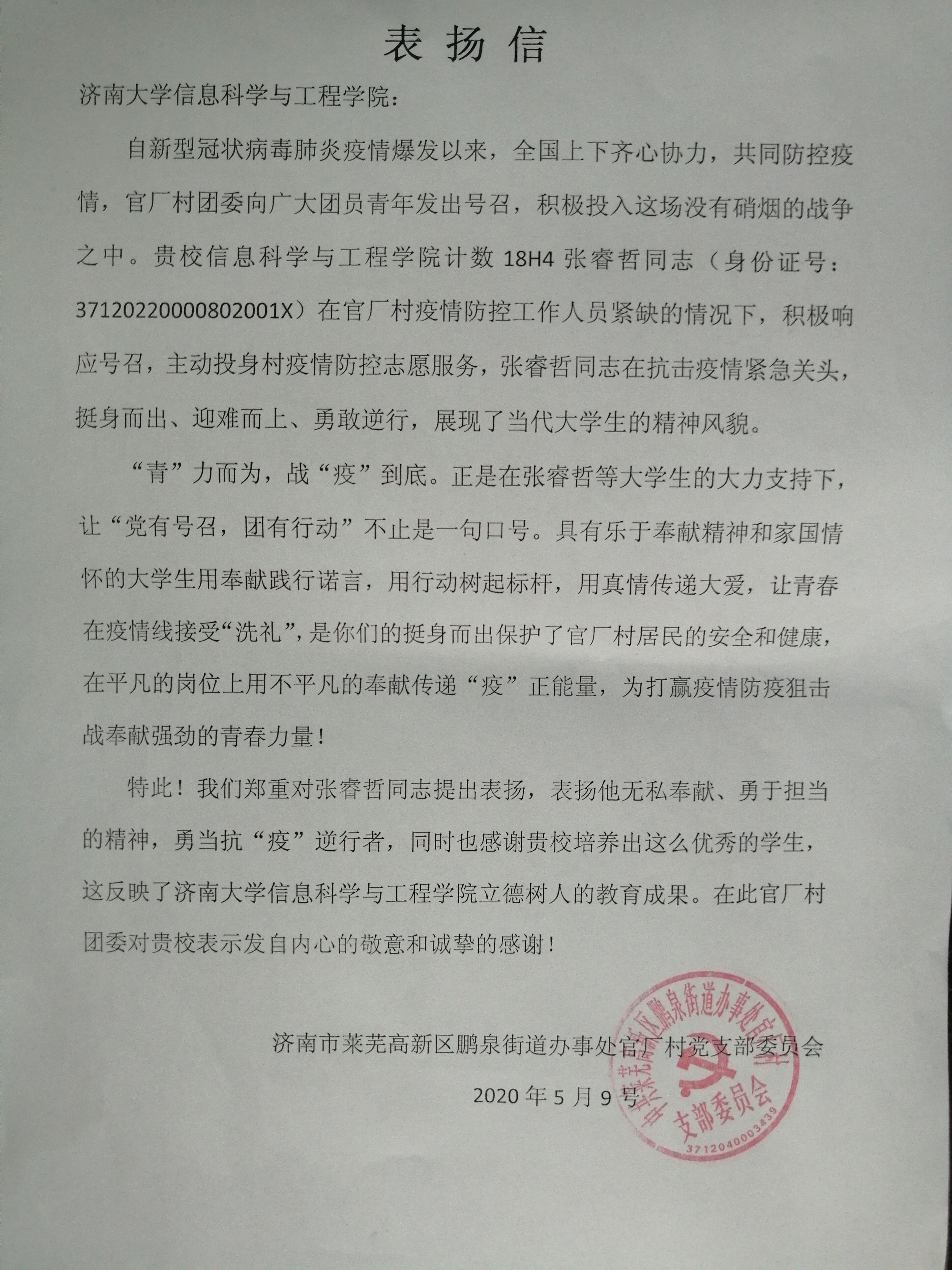 2020年5月14日,beat365vip官网登录入口收到一封来自“济南市莱芜高新区鹏泉街道办事处官厂村党支部委员会”的感谢信,感谢beat365官网大学生计数18H4张睿哲同学为当地的疫情防控做出的贡献,赞扬张睿哲同学这种无私奉献的精神。