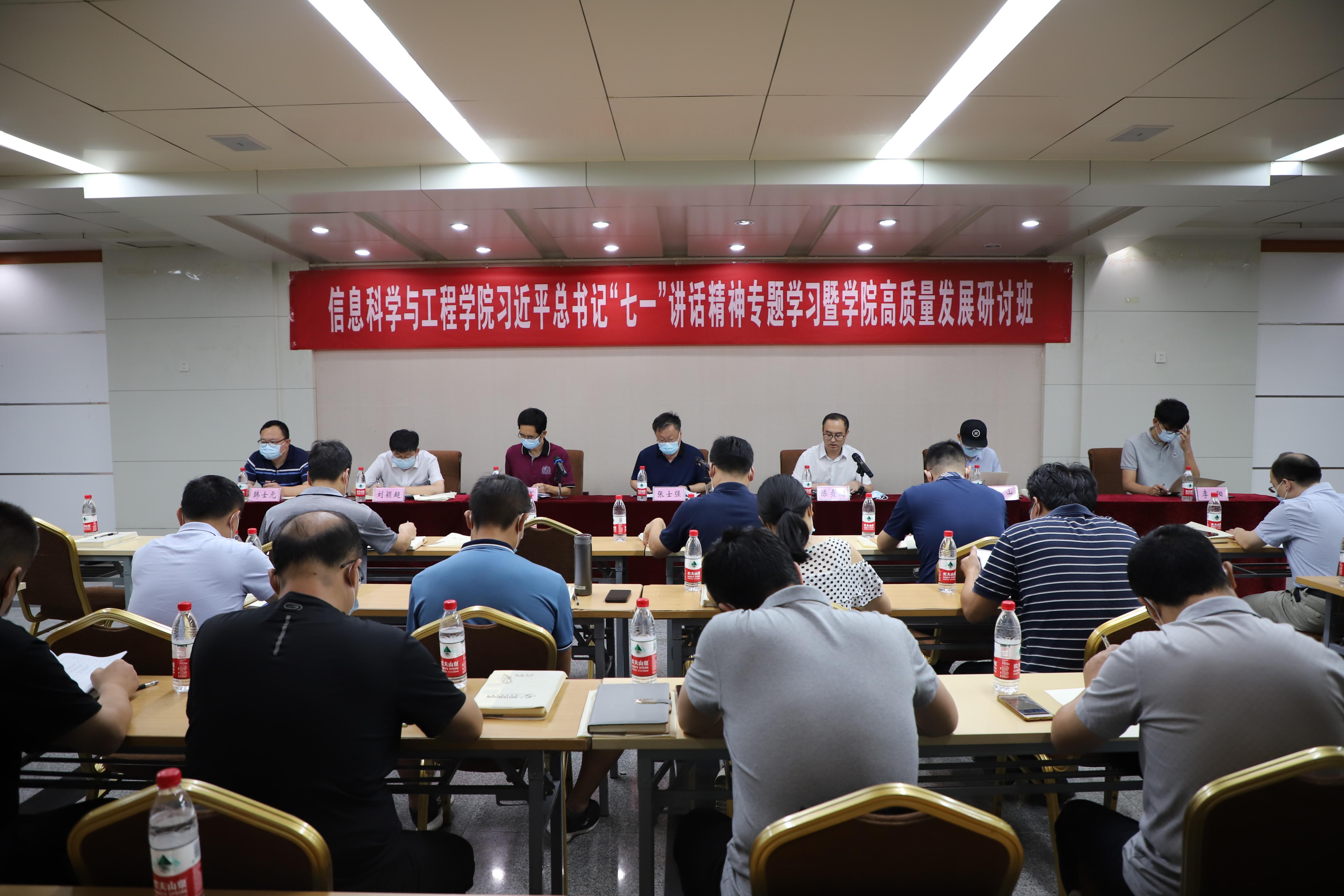 张士强校长在讲话中指出,此次研讨班的举办恰逢其时,十分必要,既是对习近平总书记“七一”重要讲话精神的一次深入学习,又对学院下一步的发展起到了很好的推动作用,同时也为其他学院做出了榜样示范作用。张校长系统总结了学院在“十三五”期间的主要工作,肯定了学院取得的成绩,尤其是在人才培养、学科建设、科学研究、社会服务等方面取得的一系列成果,并对学院近几年来取得的成绩表示祝贺,对学院为学校发展做出的贡献表示感谢。张校长表示,此次研讨班涉及学院工作的方方面面,内容丰富,目标明确,具有较强的针对性和实效性。针对此次研讨班的重点内容,张校长提出了三点建议。一是在高等教育高质量发展、教育评价改革的大背景下,如何紧紧围绕人才培养目标,创新人才培养方式,激发学生学习主动性,把“要我学”变成“我要学”;二是如何把握第四次工业革命机遇,加强高校与社会、行业、企业的深度融合,实现多学科交叉融合发展;三是如何以科学研究的目的为指引,明确主攻方向,形成专业特色,从而更好地融入社会、服务社会。最后,张校长预祝此次研讨班圆满成功,希望通过研讨,信息学院能够统一思想,凝聚共识,在“十四五”期间取得更加优异的成绩。