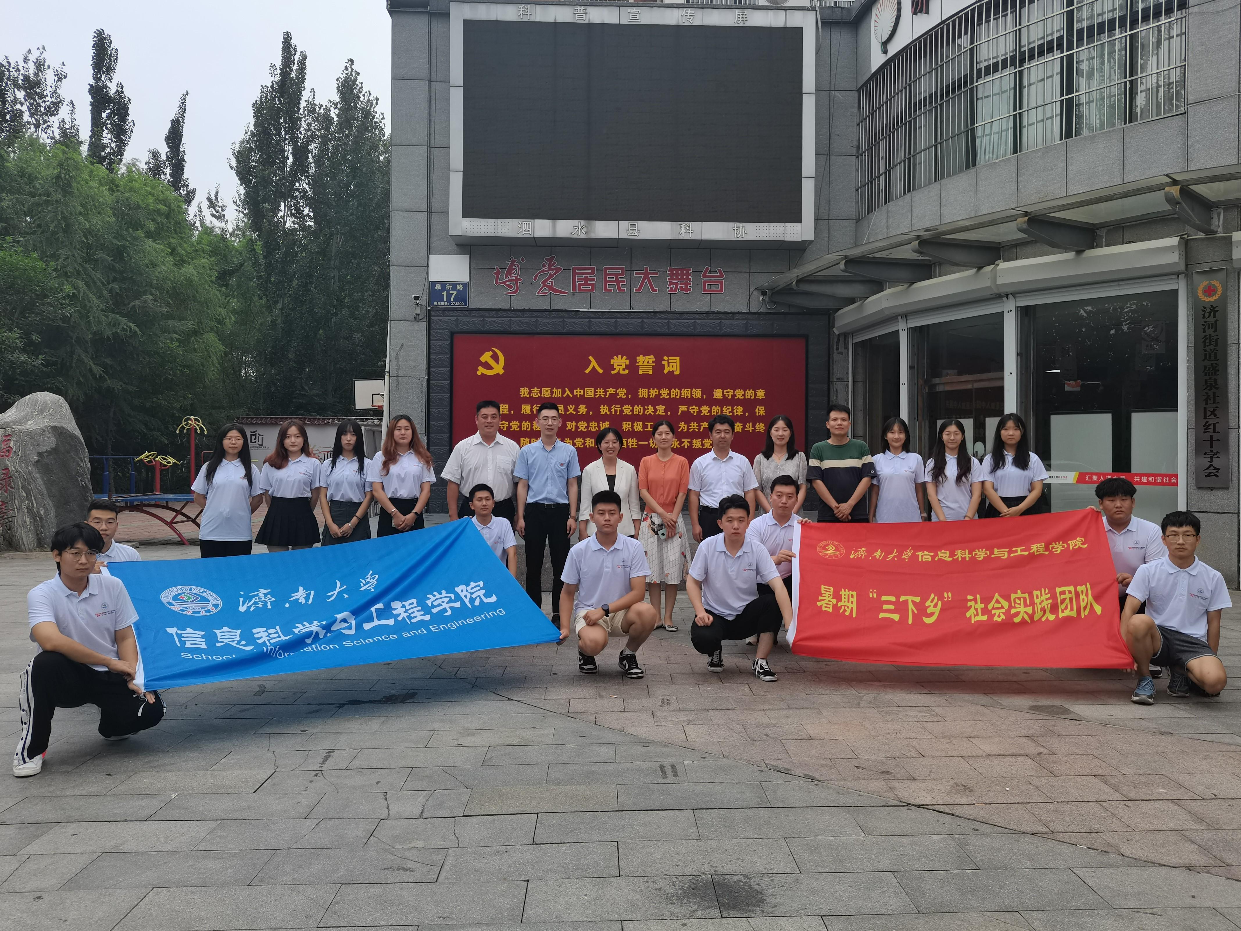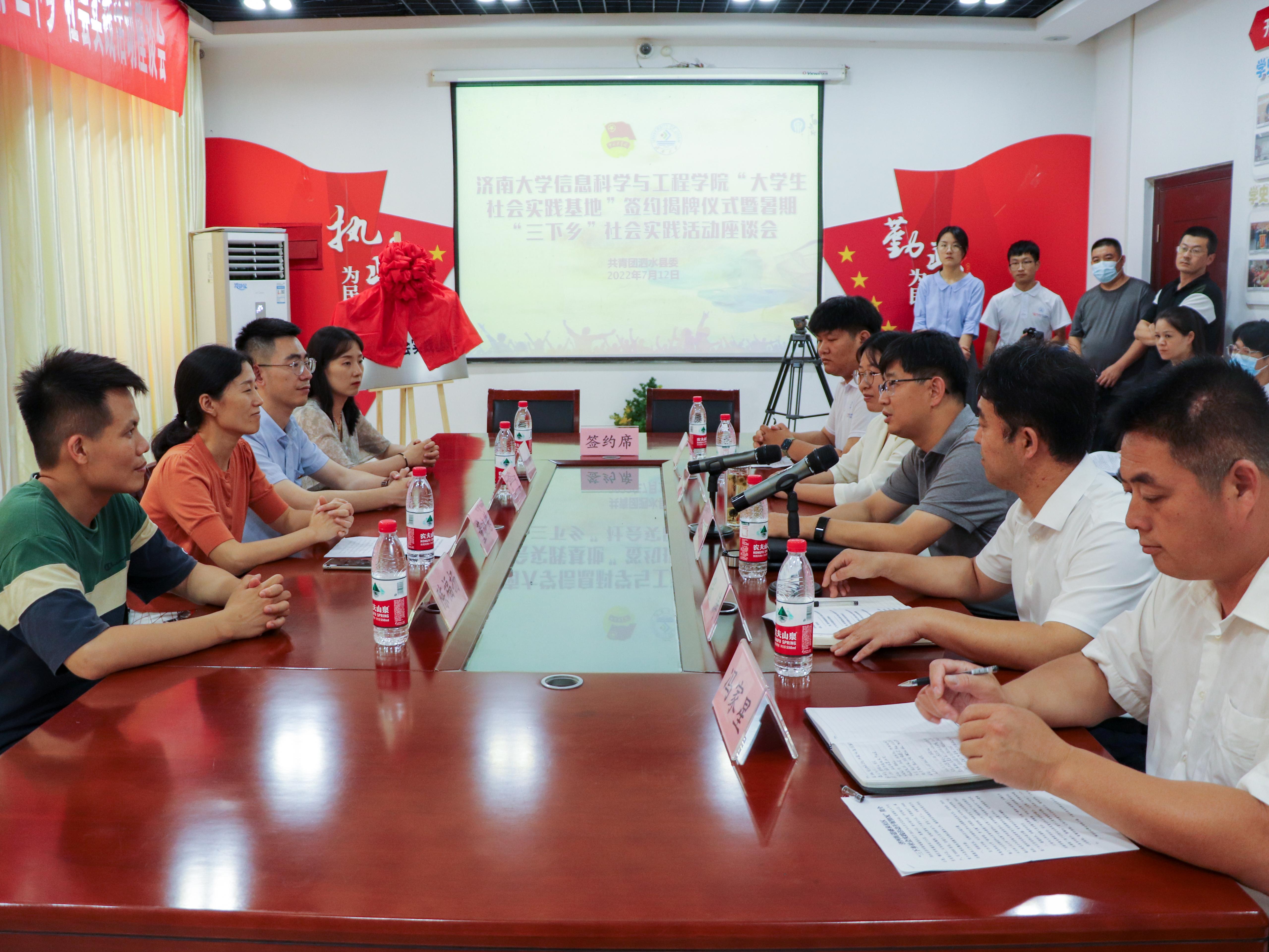 7月12日下午,beat365vip官网登录入口与共青团泗水县委、泗水县济河街道盛泉社区举行“大学生社会实践基地”签约揭牌仪式暨暑期“三下乡”社会实践活动座谈会,泗水县委副书记张宇飞,共青团泗水县委书记王晓,济河街道盛泉社区党委书记冯家星,beat365vip官网登录入口党委副书记、副院长董晓慧,团委书记王豪出席仪式,共青团泗水县委、泗水县济河街道盛泉社区相关工作人员,学院学生工作人员以及学院暑期“三下乡”社会实践团队成员等参加活动。仪式由泗水县济河街道党工委书记张涛主持。
