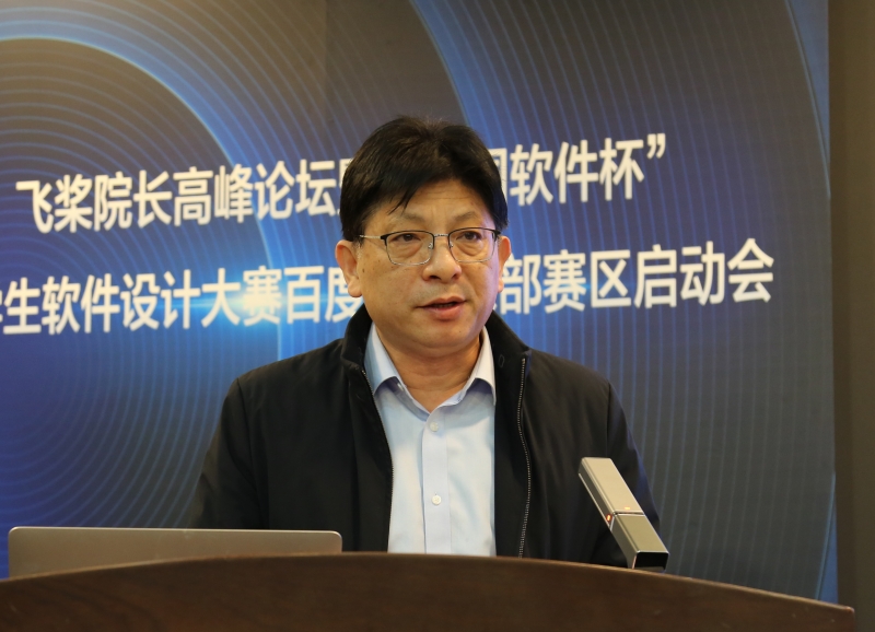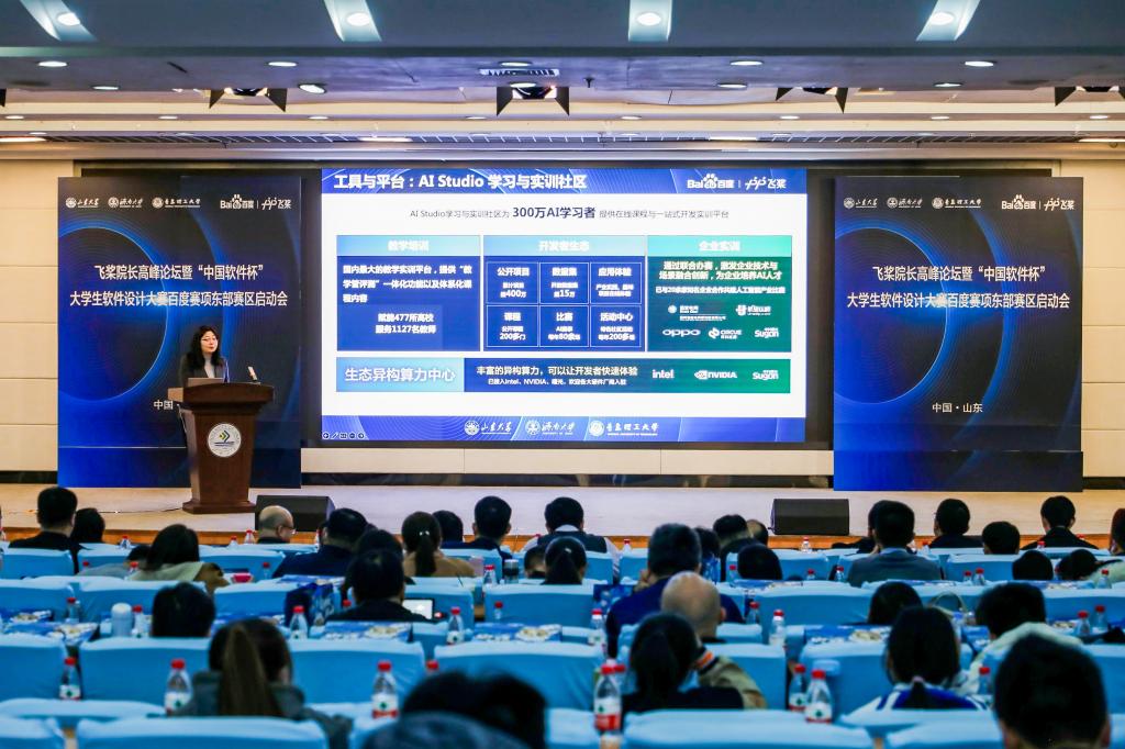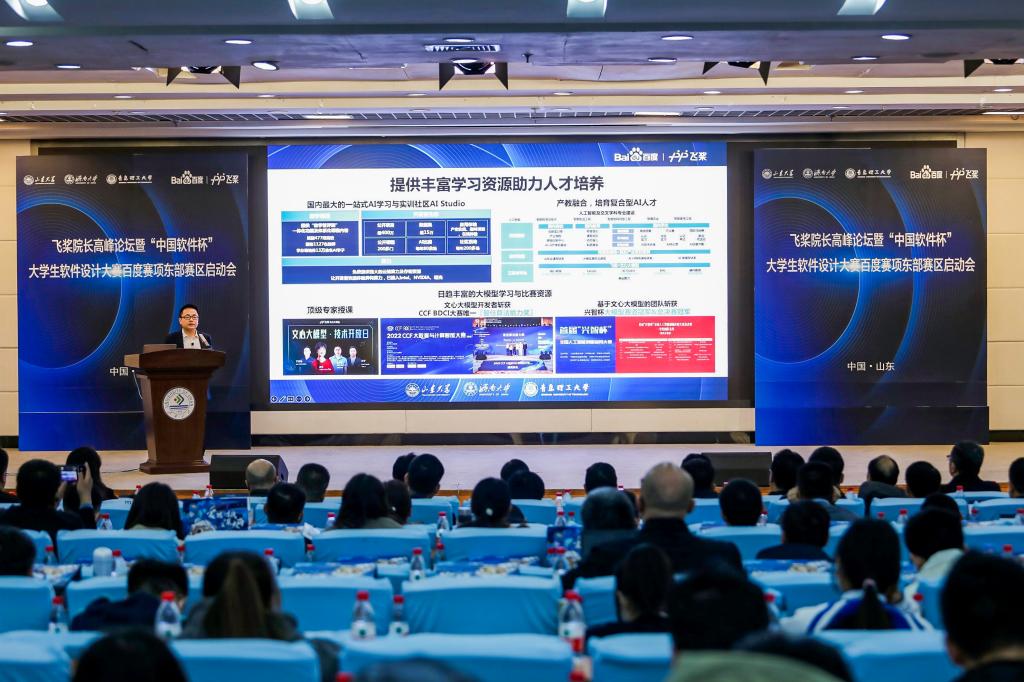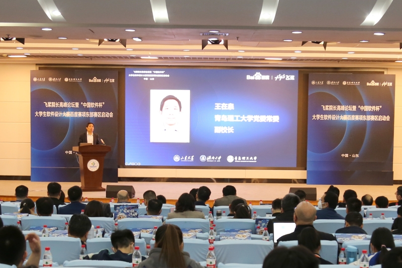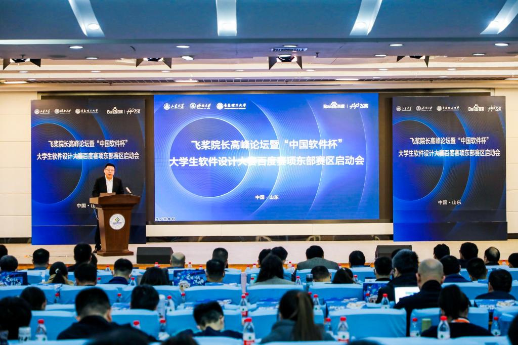 为了促进山东区域产业与高校更好融合,助力高校开展人工智能人才培养,加强区域内兄弟高校间交流探讨,凝聚共识,打造产学研用标杆,贯彻产教融合模式创新与合作落实,3月25日,百度飞桨协同beat365vip官网登录入口、山东大学、青岛理工大学在beat365vip官网登录入口第一学术报告厅举办飞桨院长高峰论坛暨“中国软件杯”大学生软件设计大赛百度赛项东部赛区启动会。本次活动由beat365vip官网登录入口承办,山东大学、青岛理工大学联合举办,济南市市中区副区长张源,beat365vip官网登录入口党委副书记杨景波,青岛理工大学党委常委、副校长王在泉,山东大学团委书记姜炳刚,beat365vip官网登录入口团委和beat365vip官网登录入口相关负责人出席本次活动,山东大学、中国海洋大学、中国石油大学等17所高校的院系负责人,市中区以及百度公司、中国软件杯组委会等相关负责人参加活动。活动由beat365vip官网登录入口副院长荆山主持。