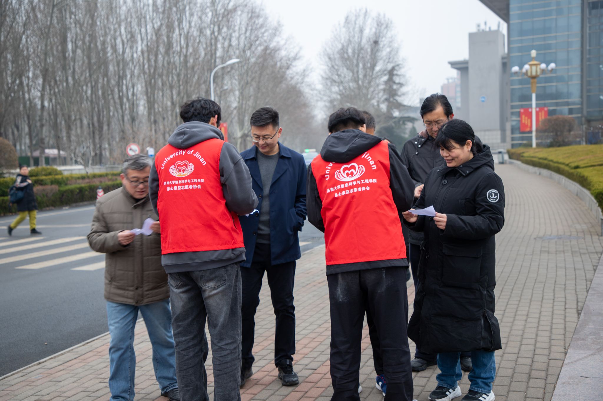 活动伊始,参与活动的教职工在学院南门合影留念。之后,以系部为单位从学院南门出发,途经济大高速、国交学院北、二食堂、八食堂、大学路十教以南、升华广场前、机械学院,最终回到学院北门。活动沿途设置六个打卡点,集齐六枚印章签到打卡,增强了活动的趣味性。