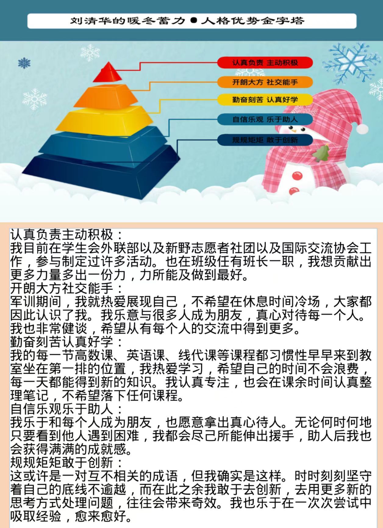 活动中,同学们循着“认知—梳理—构建—践行”的路径,逐步完成属于自己的“人格优势金字塔”搭建。在优势探索环节,大家通过心理测评、同伴互评、成长复盘等多元方式,挖掘出自身隐藏的潜能优势,从“善于倾听”“逻辑清晰”到“抗压能力强”“创意丰富”,每一项优势的梳理都让同学们对自我有了更清晰的认知。在金字塔构建环节,大家将筛选出的核心优势分层排序,用色彩与文字勾勒出专属的优势图谱,不少同学在分享时感慨:“原来我有这么多没发现的闪光点,这让我对未来的学习生活更有底气了。”