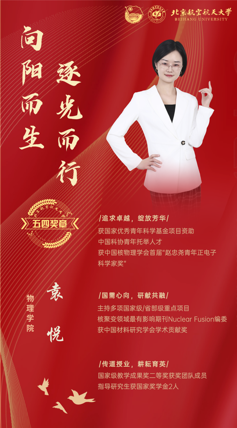 指导研究生数十人,所指导的学生获得多项国家级和省部级奖励。主讲本科生核心课程,获学生广泛好评。开设科研课堂,引导本科生走向科研之路。作为教学团队成员,袁悦老师参与了大学物理课程的建设与思想教育案例库编写,致力于实现知识与价值的融合教育。所在团队荣获多项荣誉,包括工信部研究型教学创新团队、校级一流本科立项课程及北京高校“优质本科课程”。同时,袁悦老师还参与核能科学与工程学科建设及多个实验平台的管理,并在物理学学科评估与战略咨询中发挥作用,为北航一流理科建设贡献力量。